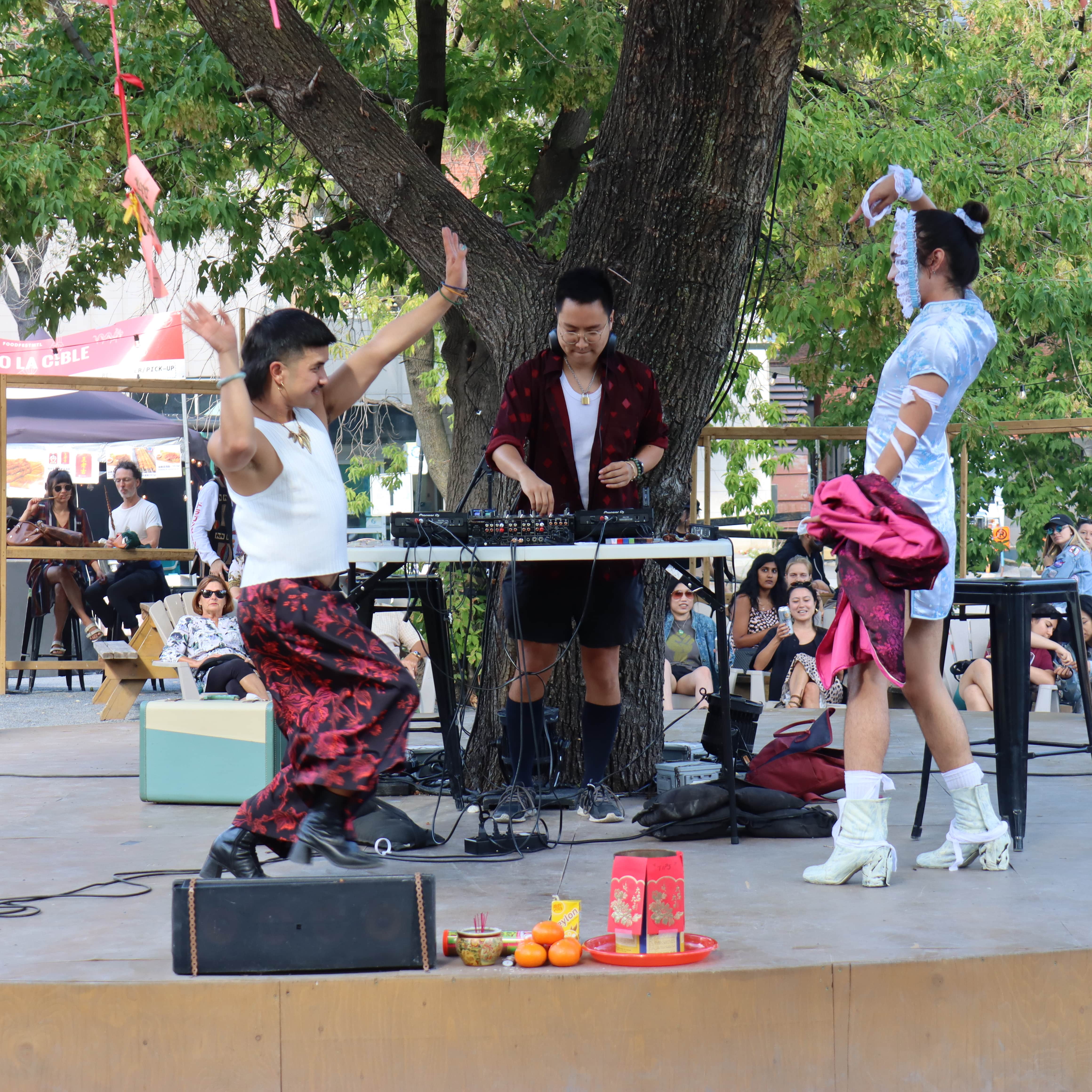 Frantz Lin and Kai started the event off with a bang with their DJ sets that matched everyone's excitement. Hua Li blessed us with her performance, reminding us that to be vulnerable is to be powerful. Beau Gomez, with his honeyed voice accompanied by Thiên-Thi Nguyen playing bass, melted the crowd into a state of romance. The ribbons on the tree at the centre of the Place Des Souhaits seemed to sway, matching the rhythm of his mellow voice. His performance was quickly followed by Lil Waterboi, accompanied by his friends JT and Mando, all of whom brought their daring spirit to the stage. Then, Miranda Chan hypnotized the crowd with her dance performance, showing just how the body can move so freely with just the right amount of control, all while inviting people to join her in dance.