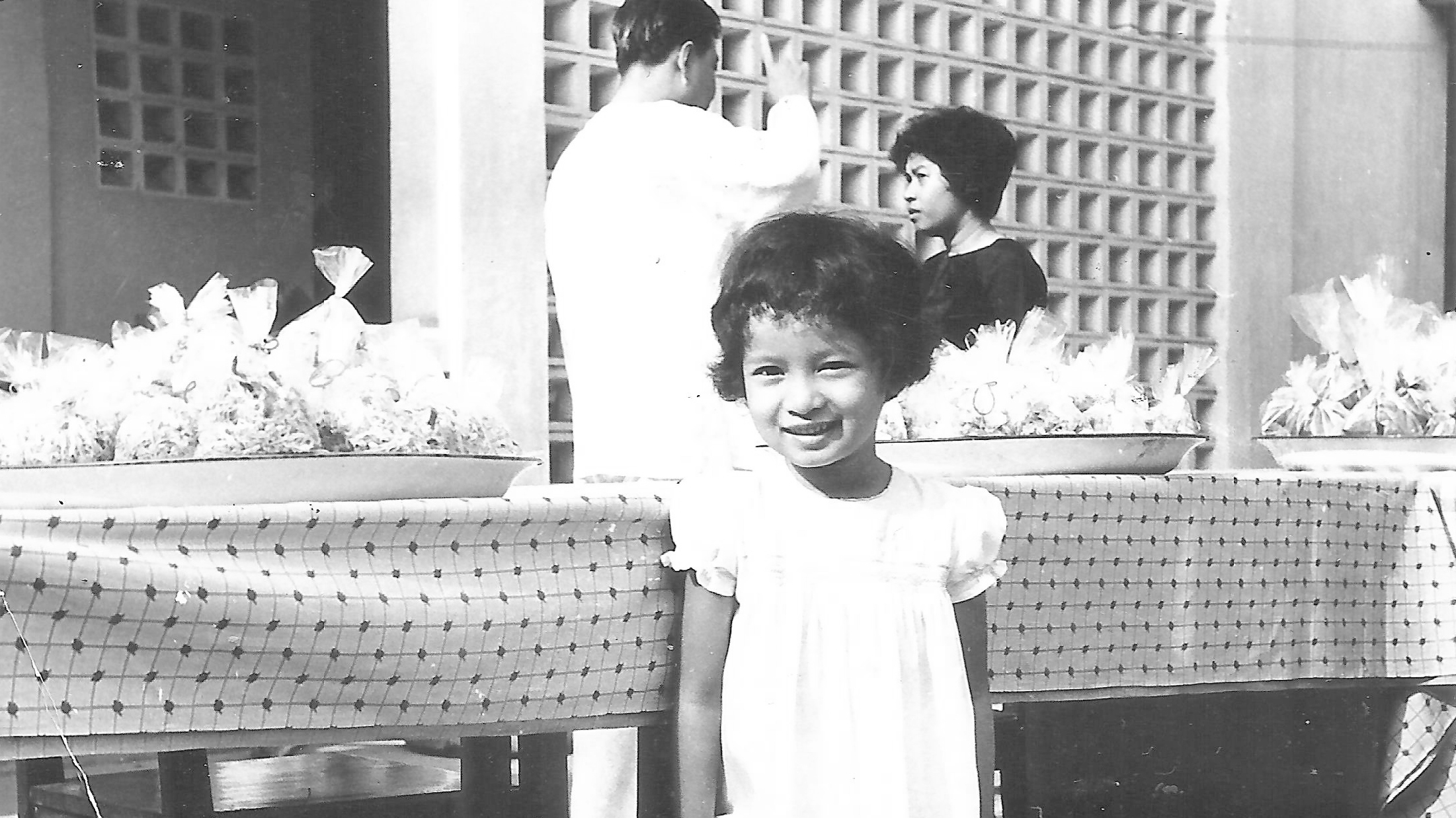 Ma mère, enfant, et ses parents qui discutent, maison familiale, Phnom Penh, Cambodge, 1964.